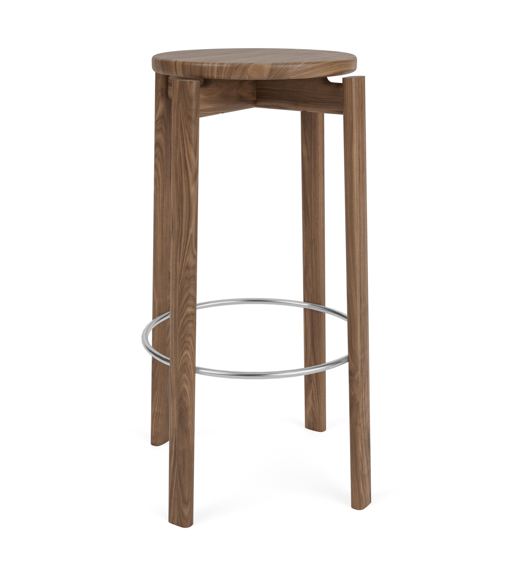 Looking to time-honoured Danish cabinetmaking traditions the Passage Bar Stool in walnut or natural oak showcases modern design and woodworking through traditional techniques. Crafted from solid walnut or FSC-certified solid oak with a lacquered finish the rich colour and luxurious grain pattern inherent to the high-quality hardwood ensure an enduring aesthetic. Thoughtfully designed a black or brushed brass foot ring ensures a comfortable seating experience for extended periods while the stools bar height aligns seamlessly with kitchens and other communal spaces making it a versatile design that effortlessly blends functionality with comfort. Its ingenious flat-pack construction encourages active participation in the assembly process.