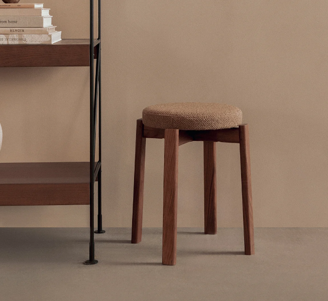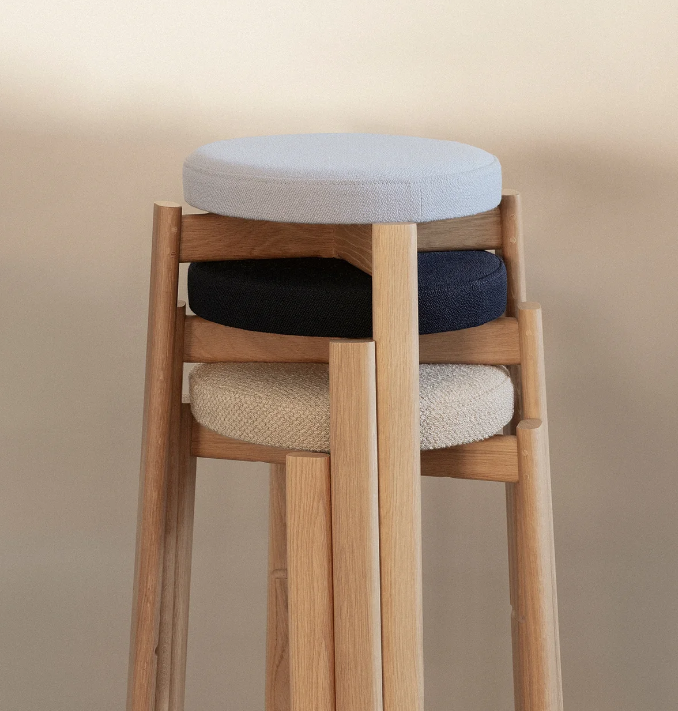 The Passage Collection demonstrates meticulous attention to detail highlighting a commitment to both comfort and aesthetics rooted in traditional woodworking techniques. In solid lacquered walnut or FSC-certified solid oak the stackable stool presents unique grain patterns inherent to the high-quality hardwoods and a warm and inviting expression. With its upholstered seat offered in customisable fabric options for a personal touch the small but perfectly formed design provides a comfortable seating experience for extended periods.