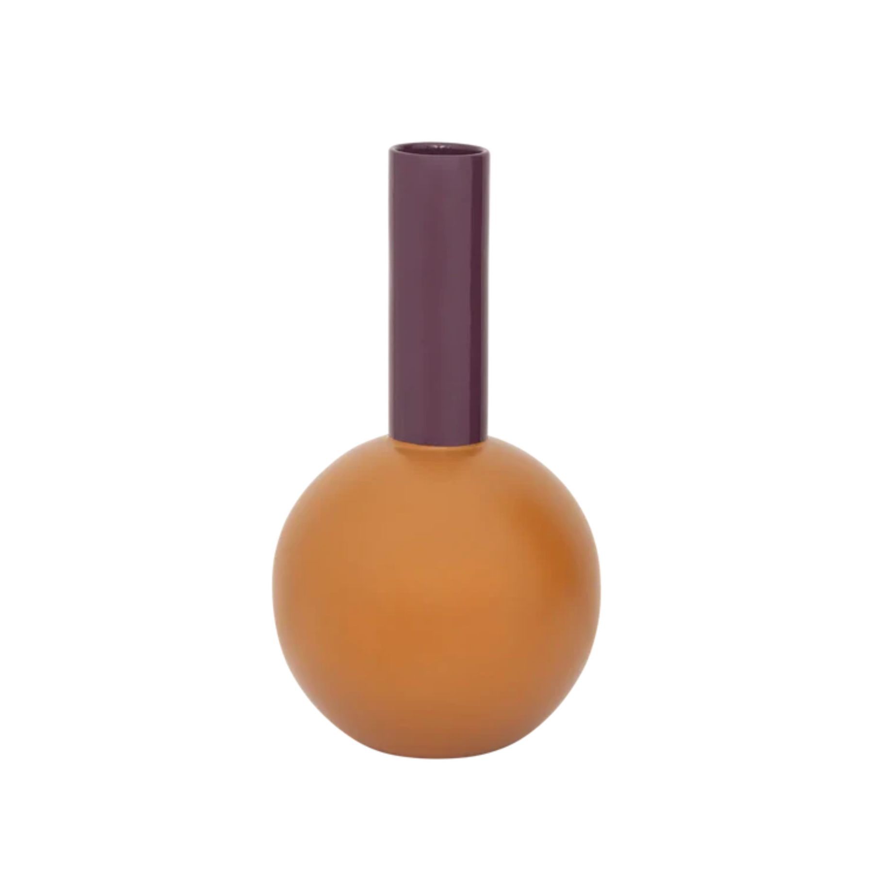 Purple and orange in bold contrast colours define this colour-block vase. It adds warmth and vibrance to sideboards or shelves. An expressive ceramic piece that turns heads.